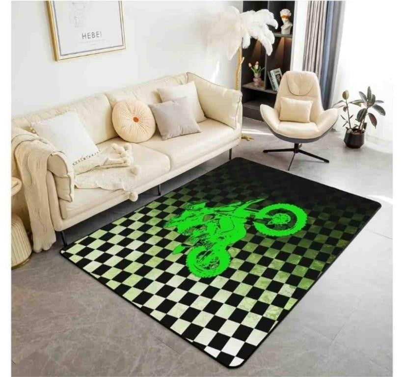 Boys Dirt Bike Area Rug, Motocross Rider Rug, Black and White Buffalo Plaid Carpet, Cool Sport Car Fluorescent Green Motorcycle Accent Rug for Kids Teens,Size: 4'11" x 3'3" (Rectangular)