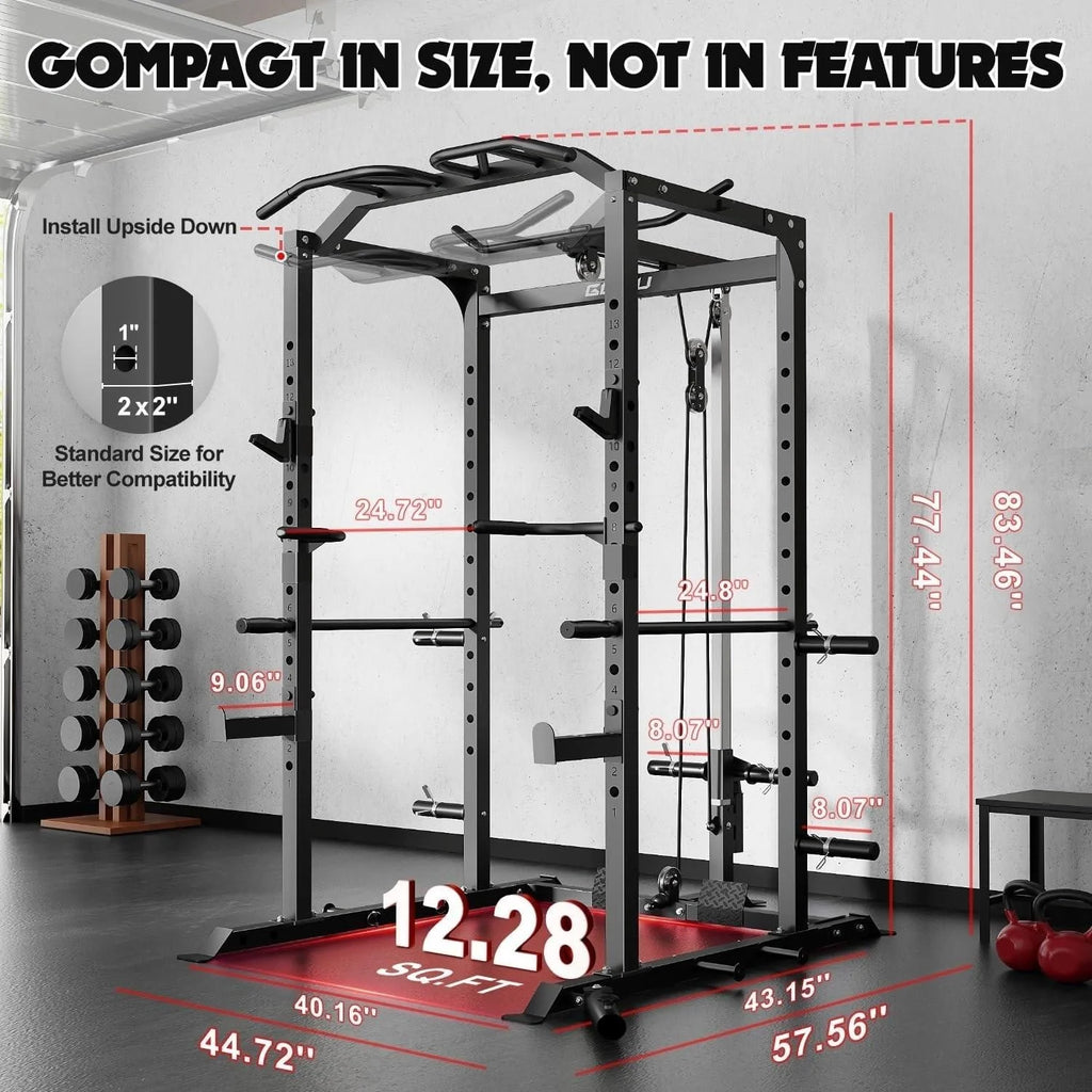Whether you're working on your chest, back, arms, or legs, this system has you covered. Compact Design for Any Space: Despite its robust build, this power cage only occupies 17.88 square feet of floor space, making it perfect for apartments, garages, or small home gyms.Our cage features an expanded base for unmatched stability, ensuring it stays firmly grounded no matter how intense your workout gets.