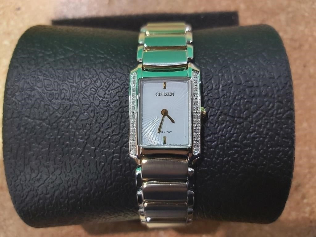 Citizen Eco-Drive rectangular two-tone stainless steel case and bracelet, white dial, 24-diamond case, Spherical SC, 30x20mm case, WR, deployment clasp with push button. LADIES