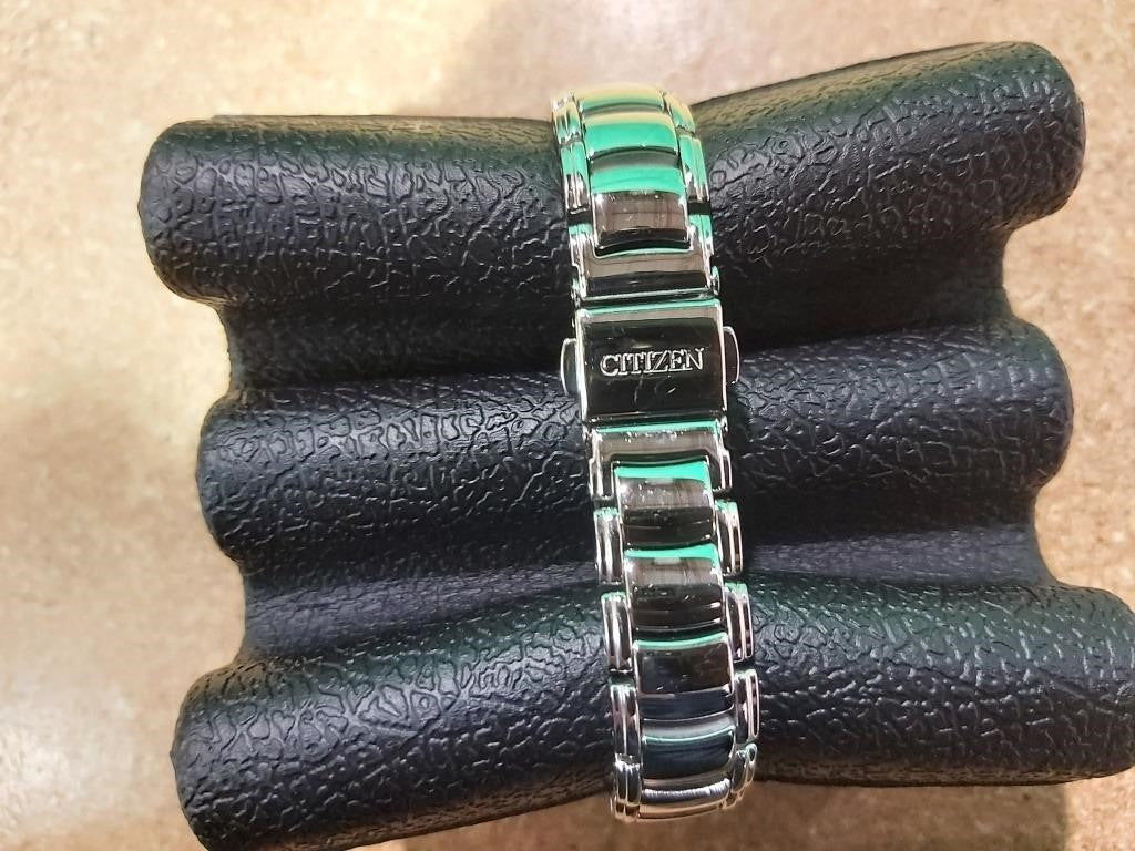 Citizen Eco-Drive round stainless steel case and bracelet, 3-diamond silver-tone dial, 20-diamond bezel, date, 26mm case, WR100, fold over clasp with push button LADIES