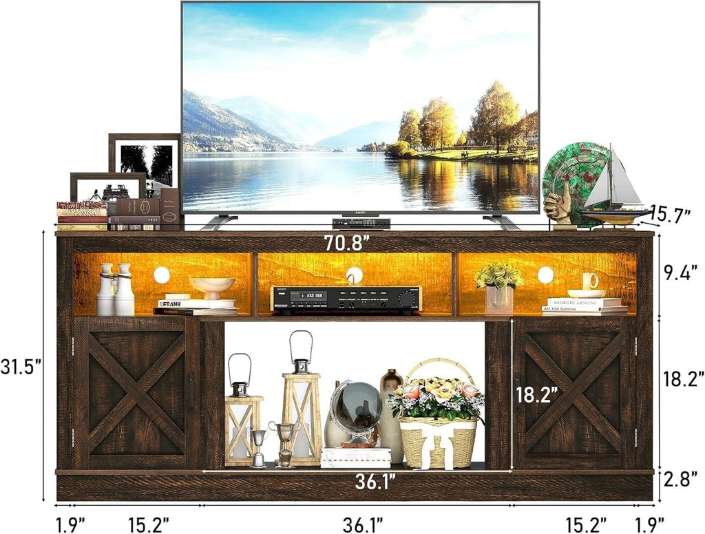 Dimension:Overall size: 15.7"D x 70.8" W x 31.5"H, fits TVs up to 85 inches (jiteentarou farmhouse TV stand with LED lights for 65/70/75/80/85 inch TVs etc.) Classic Modern Farmhouse Style:A farmhouse TV stand with barn doors embraces rustic charm and sophistication.