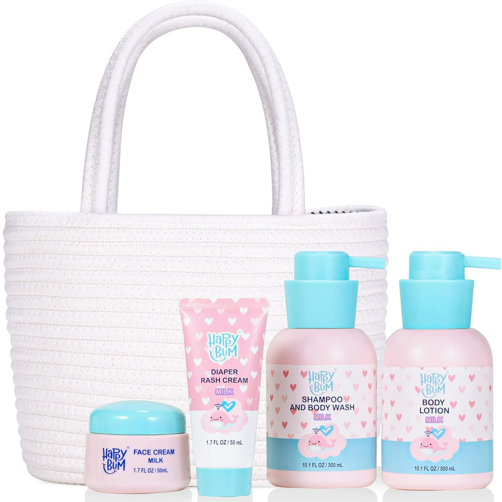 Baby Wash Gift Set Included Body Wash and Shampoo, Body Lotion, Baby Face Cream, Baby Diaper Cream and Cotton Rope Basket Diaper Caddy Organizer for Baby