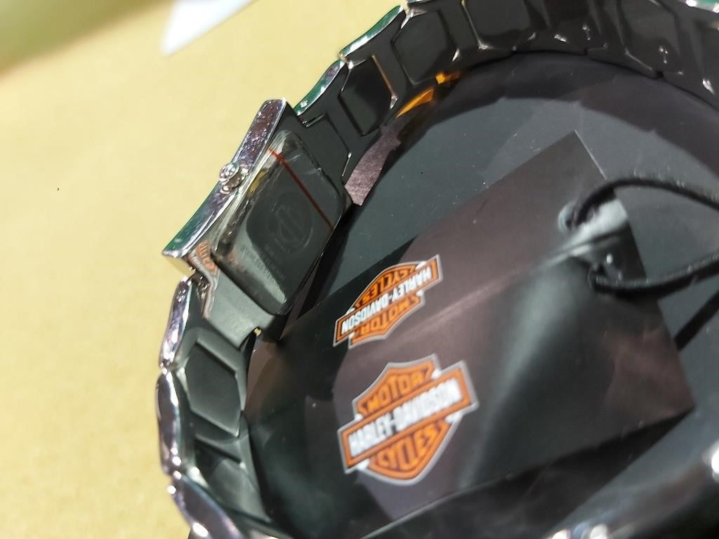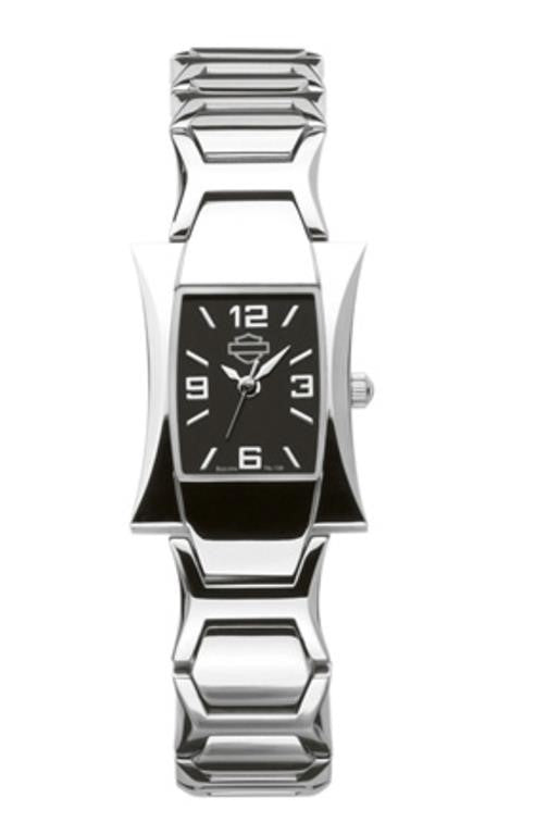 W9 Harley Davison Stainless Steel Metalized Curved Mineral Crystal Stainless Steel Jewelry Clasp Ladies Open Box Excellent condition. Glass is in mint condition. Frame is in mint condition. Very small surface scratches might be present on the band or link. Tags are still attached to the watch 195