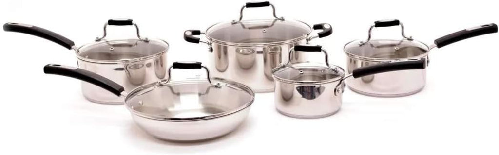 - Set includes 1 L saucepan with lid, 2 L saucepan with lid, 3 L saucepan with lid, 4.8 L casserole with lid, and 1.8 L frying with lid