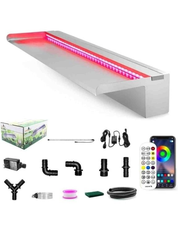 LONGRUN Stainless Steel Waterfall Spillway, APP Control Multi-Color LED Light Outdoor Pool Fountain, Water Spillway Koi Pond Waterfalls Fountains Kit for Garden Patio Swimming Pool Decoration-90cm - Package Dimensions: 96x27x17cm