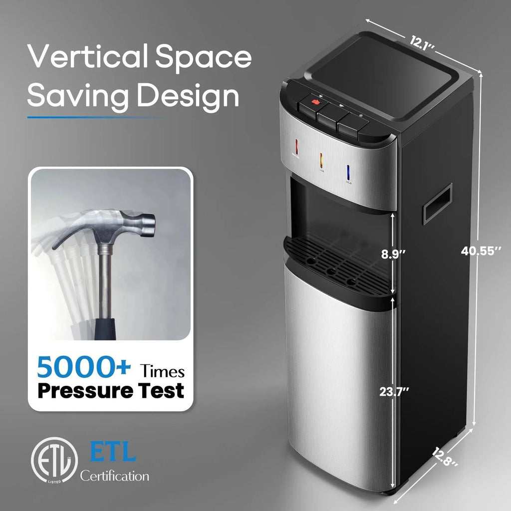 Manastin Bottom Mounted Water Dispenser 3 Temperatures Hot Cold and Room with Safety Lock LED Lighting Empty Bottle Alert Silver The Manastin bottom mounted water dispenser is a lightweight aircraft grade aluminum alloy unit that holds a 3 to 5 gallon bottle in the base for no lift refills.