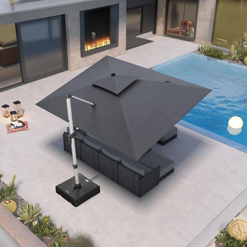 The cantilever umbrella has unique handle design and crank system, 6 height and angle to choose, 360-degree rotation for easier shading area control Large Cantilever Patio Umbrella - 09 X 12FT square patio umbrella, unique double-top canopy can provide you and your family with a large enough shade area; Suitable for patios, gardens, decks, pools Base not included - Please search PURPLE LEAF DY1130 for water tank base, PURPLE LEAF anchor ground base or steel plate base.