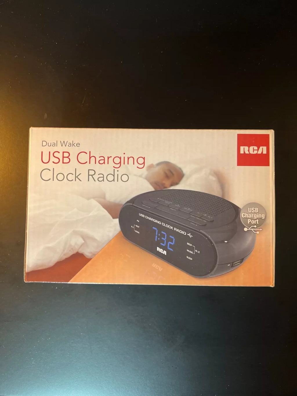 RCA CLOCK with USB charging clock radioPut USB charging right where you need it: on your nightstand. This compact, basic clock radio lets you keep your smartphone or other USB-charged device powered and within arms reach. All the basic clock radio bases are covered: dual wake for multiple alarm times, sleep and snooze, a no-worry battery backup, and two options for wake (radio or alarm).