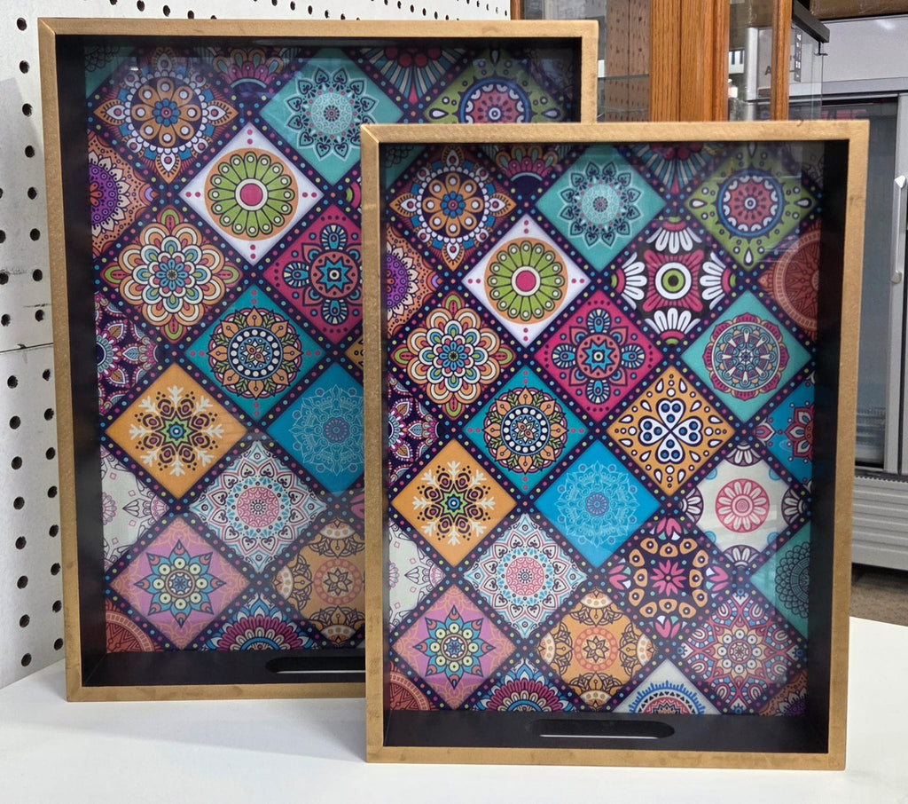 Set of wooden trays with a multi-color mandala design.