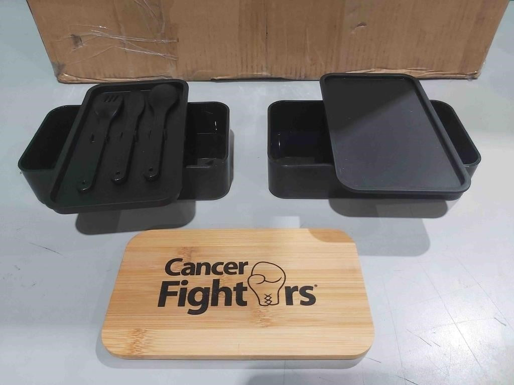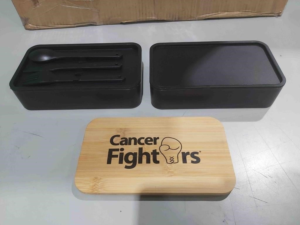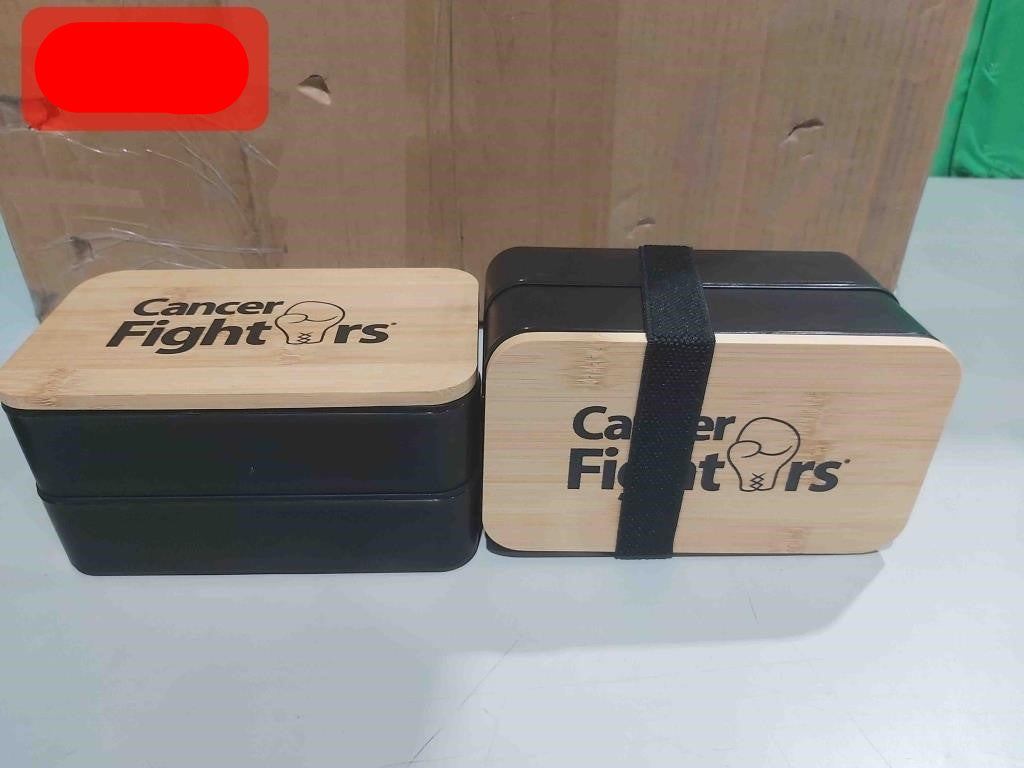 Stackable Dual-Layer Lunch Boxes with Cancer Fighters Stamp On Lid, Plastic Cutlery And Elastic Strap Included - Black Base And Wood Grain Lid -Package Dimensions: 20x18x10cm