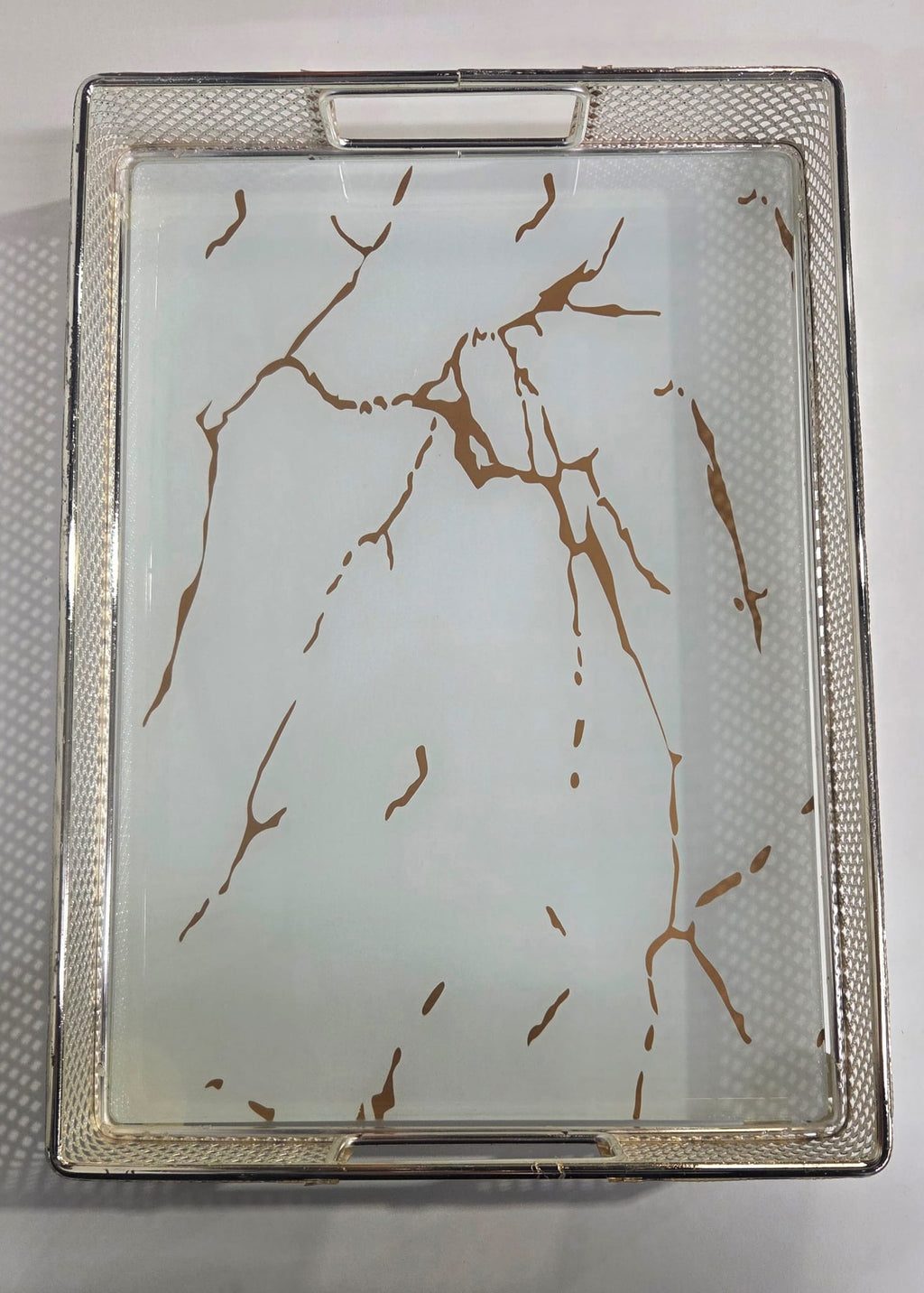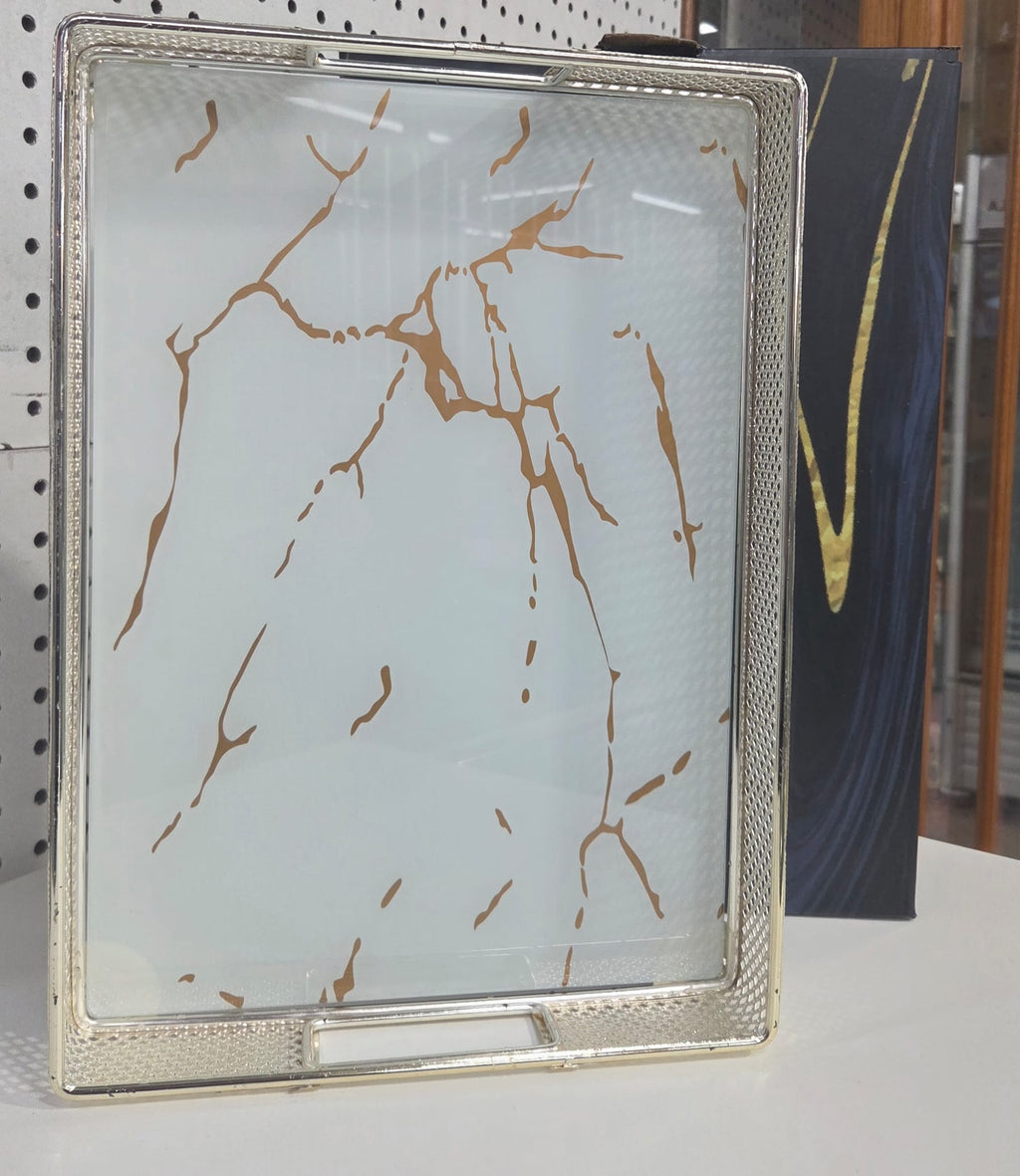 white and gold marble-patterned decorative serving tray with a silver-toned