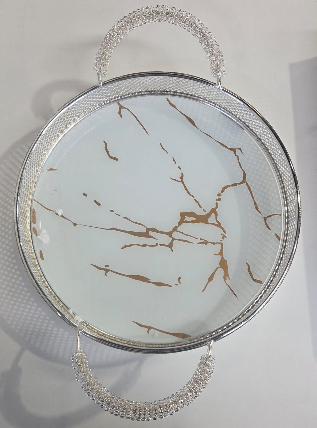 round silver-toned metal  tray with a white and gold-toned marble pattern and crystal-beaded handles.